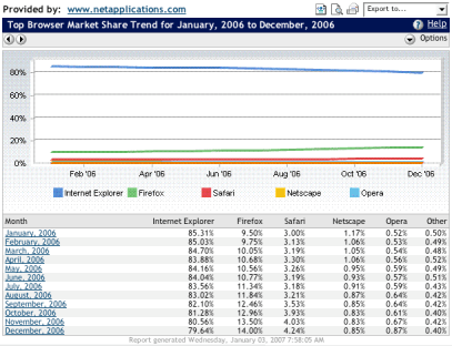 Firefox went from 9.57% in December 2005 to 14.0% in December 2006, a 46.29% increase year-over-year.