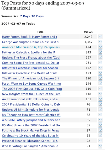 Until recently, however, my top traffic driver was still the Harry Potter posts, with American Idol, Battlestar Galactica, and Coins all bringing in significant visits as well. Personal Finance has been a steady performer for me, and the most requested. However, it’s not generating the page views. Here are the top posts from the last 30 days.