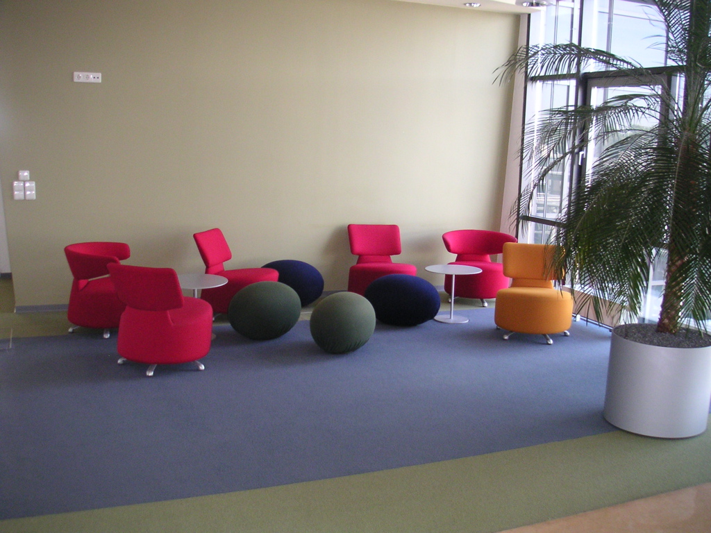 We’ve arrived here at the eBay Germany offices. Everything in this building looks cool, including the ultra-modern open cubes and the eBay-colored futuristic furniture. Note the cool German advertisements for eBay on the wall.