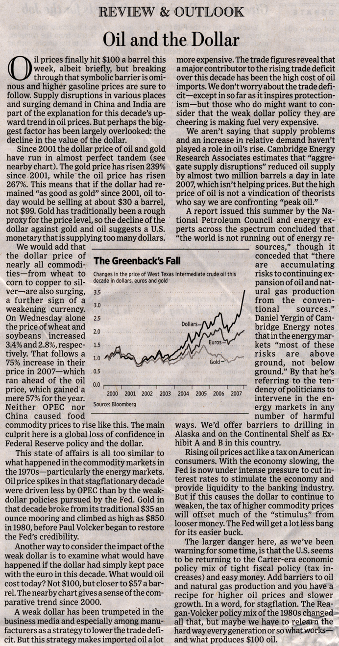 This article made me wonder – is the weak dollar the reason for $100 oil, as this article suggests, or is $100 dollar oil the cause of the weak dollar. Alternatively, is there a third cause, not mentioned, which actually is weakening the dollar and making oil more valuable?