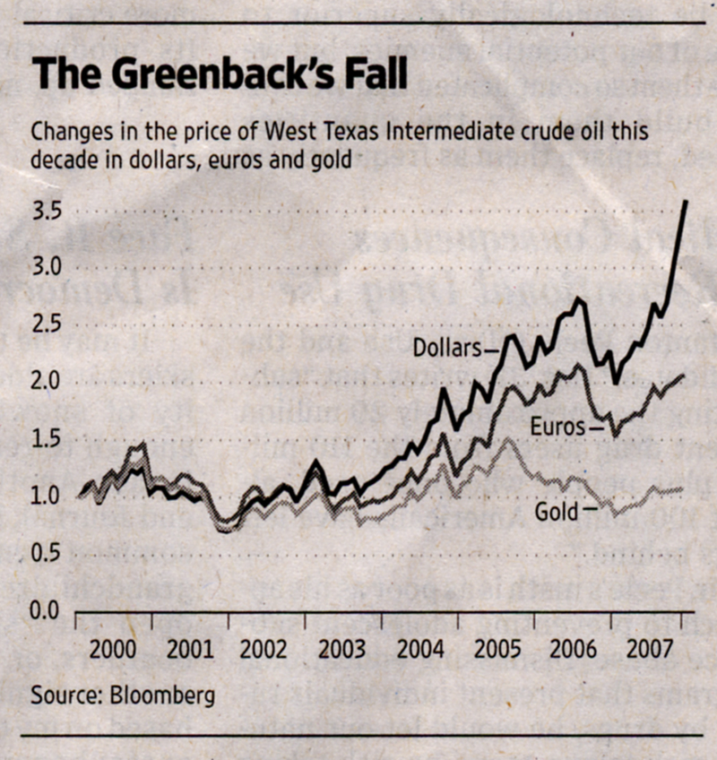 However, as I read this piece, it made me wonder, really, what does $100 dollar oil really mean? Does it mean that oil is dearer, or that the dollar is cheaper? Or both?