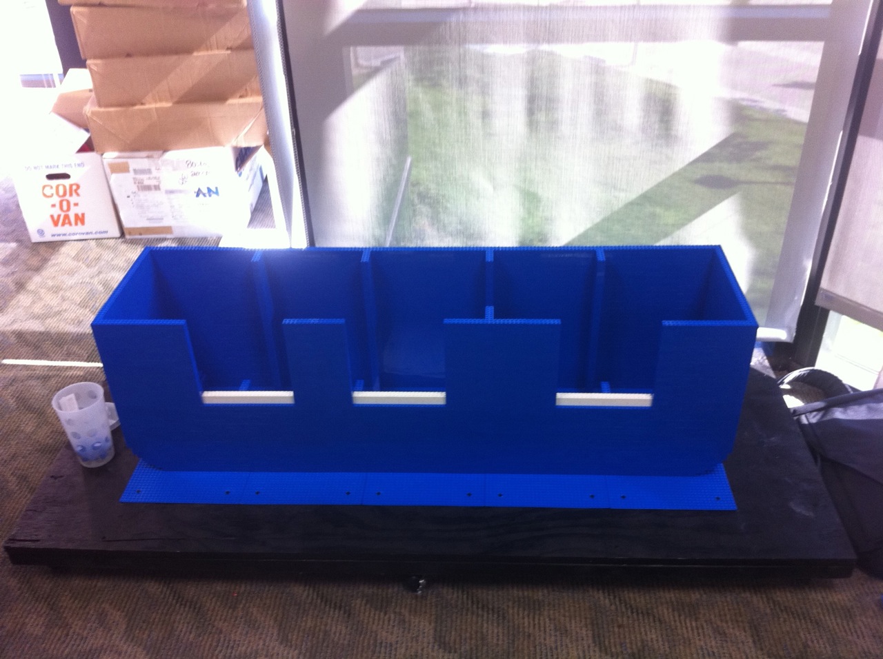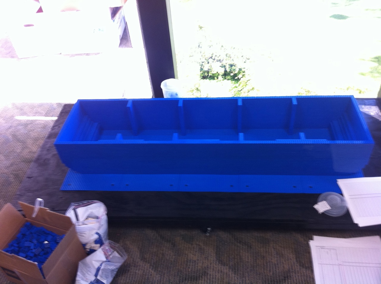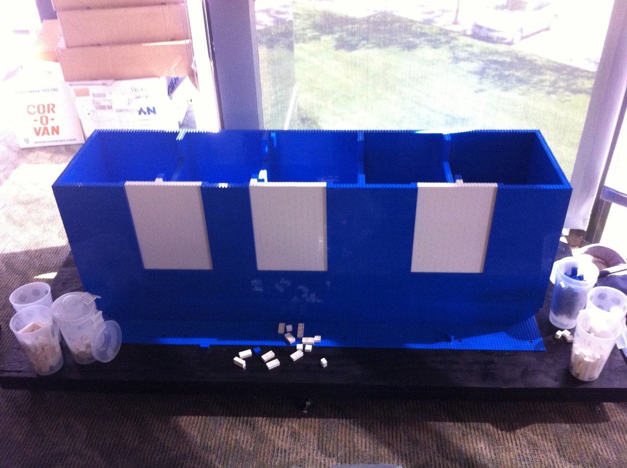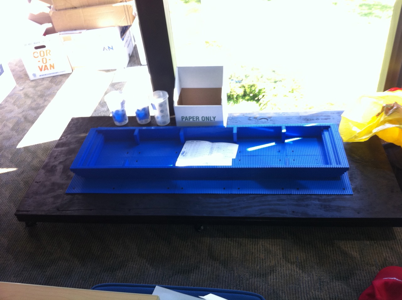 It turns out ordering 8,000 bricks (including over 5,500 2×8 blue bricks) is not a trivial exercise. LEGO.com blocks you at 999 bricks per type, and chokes over a certain dollar amount. Instead, after calling LEGO, it turns out that you can place an order via fax, which is what we did. In case you are wondering, the Danish don’t seem to have a concept of a “volume discount” or “corporate discount”. Either that, or they knew I’d pay for the bricks.